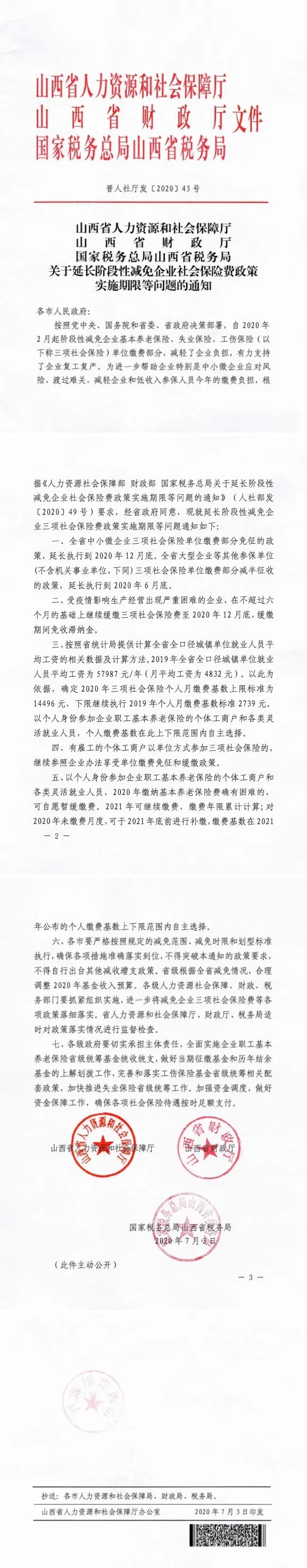 2020年7月3日,山西省人力資源和社會保障廳、山西省財政廳、國家稅務(wù)總局山西省稅務(wù)局發(fā)布了《關(guān)于延長階段性減免企業(yè)社會保險費政策實施期限等問題的通知》(晉人社廳發(fā)[2020]43號),就延長階段性減免企業(yè)三項社會保險費政策實施等問題做出了新的通知: