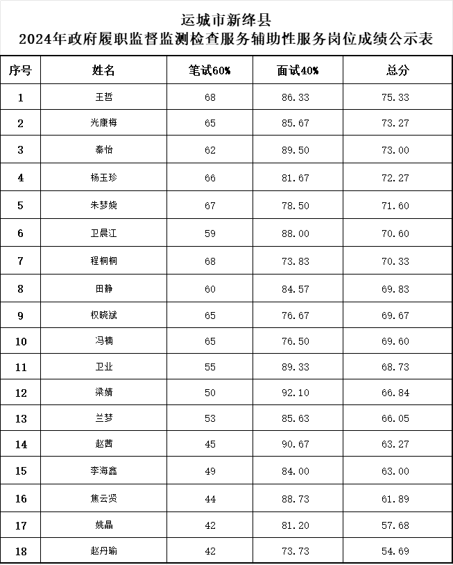 運城市2024年政府履職監(jiān)督監(jiān)測檢查輔助性服務(wù)崗位考試已如期進(jìn)行,現(xiàn)成績公示如下: